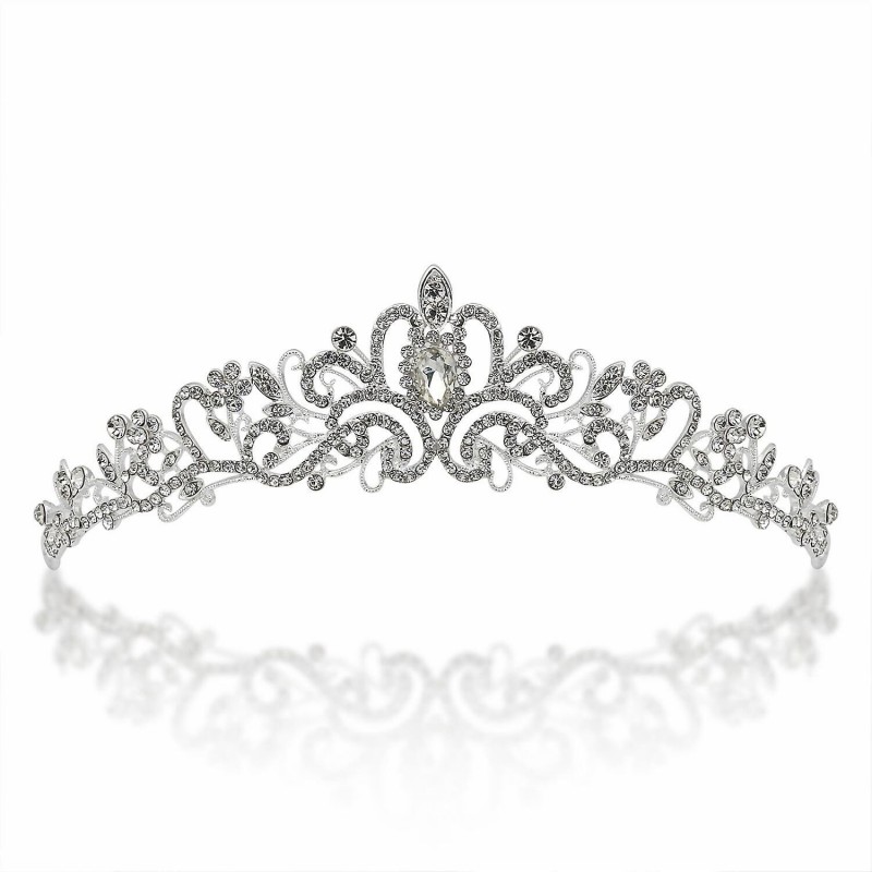 Esta impresionante tiara de plata es digna de una princesa. Presenta hermosos remolinos incrustados con cristales brillantes y diamantes de imitación. Combina perfectamente con vestidos de novia blancos y de diamantes blancos.