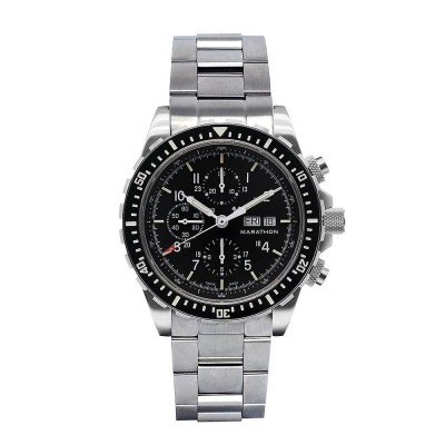 Reloj cronógrafo automático para piloto/buceador Jumbo de acero inoxidable de 46 mm (CSAR) Marathon El reloj cronógrafo automático para piloto/buceador Jumbo de 46 mm (CSAR) se conoce comúnmente como cronógrafo de búsqueda y rescate (CSAR) y es el más codiciado de nuestra clase SAR. Se considera el “Santo Grial” de nuestros relojes y es la elección perfecta para quienes exigen lo mejor en términos de calidad y rendimiento. Con un movimiento de cronógrafo automático de 25 joyas con una precisión de 1/5 de segundo, la función de cronómetro utiliza una sincronización decimal de 1/100 de minuto para su uso en registros de vuelo y seguimiento del consumo de combustible. El reloj puede rastrear el tiempo transcurrido hasta 12 horas, lo que lo convierte en la opción ideal para pilotos y buceadores. El movimiento está impulsado por un ETA Valjoux 7750 con amortiguador Incabloc®, lo que garantiza una cronometración confiable y precisa en todas las situaciones. El reloj también cuenta con un calendario con día y fecha. Para una fácil lectura en condiciones de poca luz, el CSAR cuenta con tubos de gas tritio y funciones de iluminación MaraGlo™. El cristal es de zafiro, lo que lo hace resistente a los arañazos y duradero, mientras que la corona atornillada garantiza una resistencia al agua hasta 30 ATM. La caja y la pulsera están hechas de acero inoxidable 316L y terminadas con una textura cepillada, lo que le proporciona un aspecto elegante y moderno. El bisel unidireccional tiene una escala de 60 minutos y el reloj tiene una clasificación de inmersión de 30 ATM, lo que lo hace perfecto para buceo y otras actividades acuáticas. El reloj tiene un diámetro de caja de 46 mm, un grosor de caja de 18 mm y un ancho de asa de 22 mm. Movimiento: ETA Valjoux 7750 con Incabloc? Amortiguador