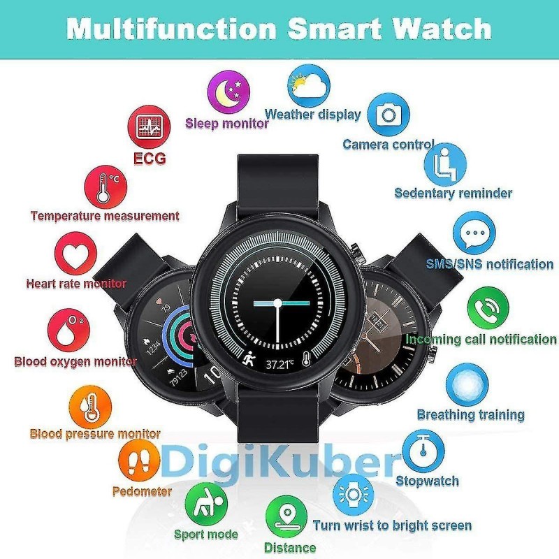 VARIAS FUNCIONES como visualización de hora y fecha, visualización del clima, notificación de llamadas y mensajes, contador de pasos, registro de consumo de calorías, registro de kilometraje deportivo, 7 modos deportivos, monitor de frecuencia cardíaca, diagnóstico de ECG / PPG / Ai, control de cámara, monitor de sueño, recordatorio sedentario, cronómetro, entrenamiento respiratorio. MONITOR DE TEMPERATURA CORPORAL DE 24 HORAS Puede medir su temperatura corporal durante 24 horas, los datos de temperatura corporal se pueden guardar en la APLICACIÓN [SmartHealth], puede controlar su temperatura corporal y controlar su salud en cualquier momento. GESTIÓN DE DEPORTES Y SALUD Seguimiento de la medición de múltiples datos deportivos y de salud: modo multideportivo, podómetro, distancia, calorías; Diagnóstico de ECG/PPG/IA/monitor de frecuencia cardíaca. Presta atención a tu salud todo el tiempo. Los datos deportivos y de salud del reloj inteligente son solo de referencia, escuche los consejos del médico. MONITOR DE SUEÑO Y PANTALLA DEL TIEMPO Función de monitoreo del sueño: cuando se duerme, el reloj inteligente calculará automáticamente la calidad de su sueño y sincronizará los datos con la aplicación. Puedes conocer la calidad del sueño. La función de visualización del clima mostrará información meteorológica actual y la calidad del aire. (Nota: necesita obtener la información de ubicación de su teléfono para ver el clima).IP68 IMPERMEABLE Y CARGA MAGNÉTICA IP68 tiene un excelente rendimiento a prueba de agua y puede satisfacer la mayoría de las necesidades diarias. (Nota: No lo sumerja en agua profunda durante mucho tiempo. Tampoco lo use en aguas termales ni baños calientes). Carga de succión magnética, el tiempo de carga es de aproximadamente 3 a 4 horas, el tiempo de uso es de aproximadamente 5 a 13 días, en espera de 20 a 40 días.